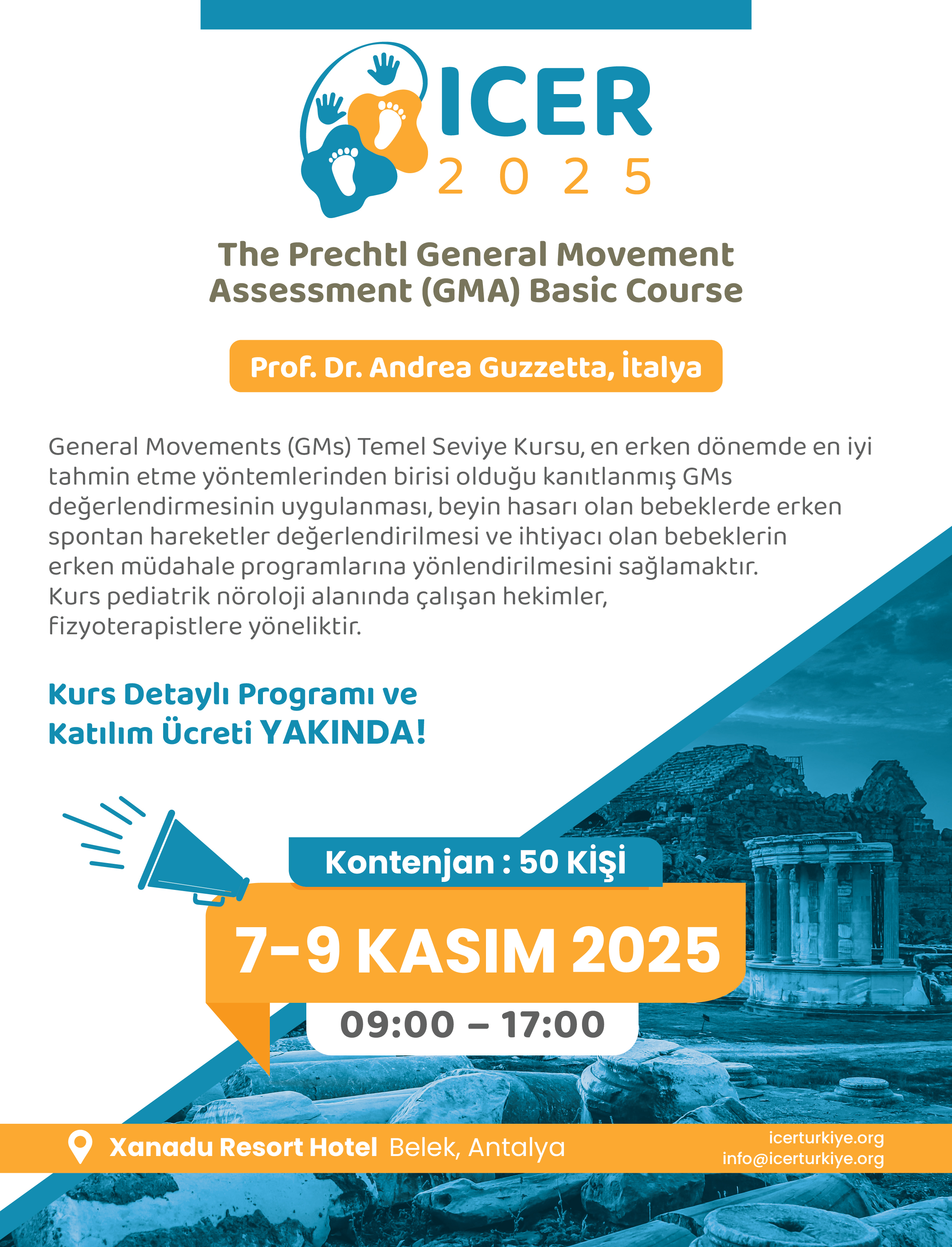General Movements (GMs) Temel Seviye Kursu, en erken dönemde en iyi tahmin etme yöntemlerinden birisi olduğu kanıtlanmış GMs değerlendirmesinin uygulanması, beyin hasarı olan bebeklerde erken spontan hareketler değerlendirilmesi ve ihtiyacı olan bebeklerin erken müdahale programlarına yönlendirilmesini sağlamaktır. Kurs, pediatrik nöroloji alanında çalışan hekimler, fizyoterapistlere yöneliktir.